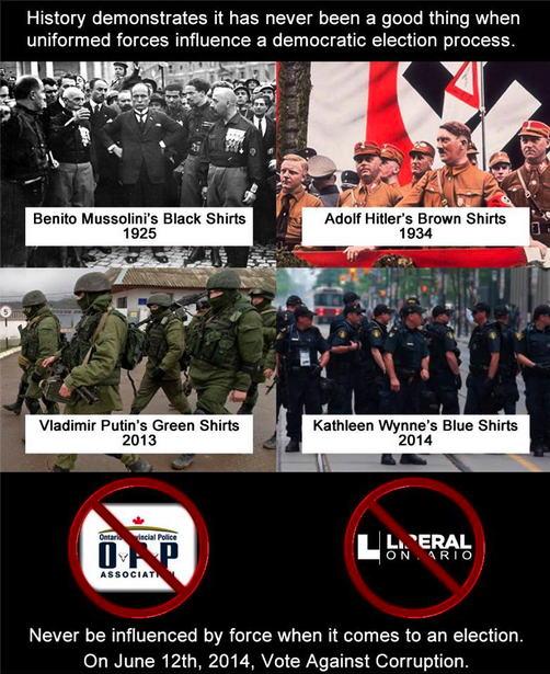 It depicts known dictators and their troops: Benito Mussolini’s black shirts, Hitler’s brown shirts, Vladimir Putin’s green shirts, along with Kathleen Wynne’s “blue shirts” — OPP officers.